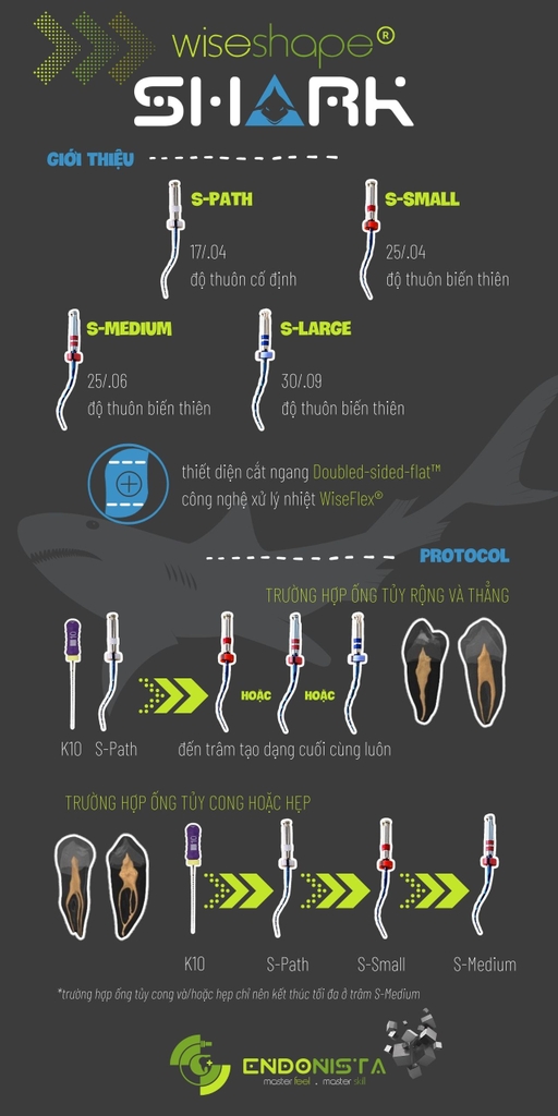 WiseShape® Shark lấy cảm hứng từ những đường nét của vây cá mập, đồng thời cũng mang trong mình sức mạnh và bản lĩnh như chúa tể của đại dương, giúp cho các bác sĩ đam mê Nội nha và cả những nha sĩ tổng quát có thể hoàn toàn tự tin làm chủ quá trình sửa soạn ống tủy của mình như những chuyên gia.